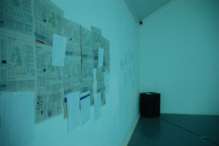 Playing the Weather was an installation realisation of the score Playing the Weather held at BLOC Space in February 2009. Six repeating loops of glockenspiel, guitar feedback, organ drones, circuit bent casio tones and acoustic guitar dyads (two note chords) were prepared, deriving their notes from the procedures described in the playing the weather score. The visual element of the installation had three parts. Firstly, the equipment itself, six CD players (one for each loop to facilitate them falling out of sync), DVD players and projectors, the PA system and its speakers. The speakers in each corner, with their leads radiating from a central anarchic pile of the equipment. Secondly a wall display of the newspaper pages from which the notes were derived and the transcriptions I made from them and a collection of quotes and the score by way of explanation of what was going on. Finally, two projections of world satellite weather imaginary lifted from the met office website, offering a backdrop which changes slowly and subtly, like the music. An unplanned consequence of using the projectors as the sole lighting was a rather eerie, cold light, this was coupled with the timing of the exhibition in the middle of a particularly cold snap with frozen snow all around the entrance to the gallery.