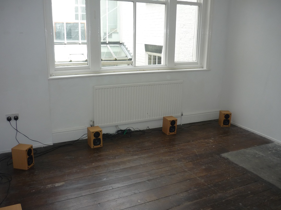 This work deals with the two fundamental units of sound art: space and time. It represents a work of quite minimal intervention, but I was surprised at how long I could sit and listen to it, hearing the slight variations and one sound entered and another gradually faded away.